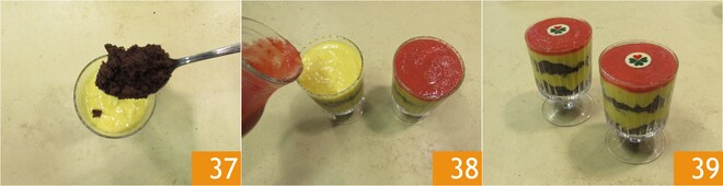 Faça uma segunda camada de crumble 37 e mousse. Deixe firmar no freezer por uma hora e depois complete com a geleia 38. Sirva sua porção individual natalina 39.