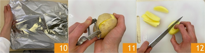 Cubra a assadeira também com uma folha de papel alumínio 10 e leve ao forno por cerca de uma hora a 180°C no forno pré-aquecido em modo ventilado. Enquanto isso, descasque as batatas 11 e corte-as em pedaços 12.