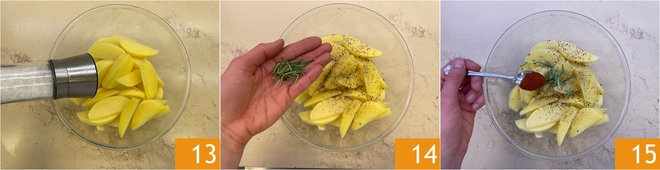 Em uma tigela, tempere as batatas com sal 13, alecrim 14, páprica 15 e pimenta-do-reino moída.
