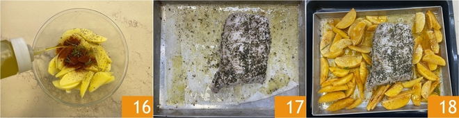 Adicione o azeite de oliva 16 e misture bem. Depois de uma hora de cozimento da carne, retire do forno 17 e adicione as batatas ao redor 18.