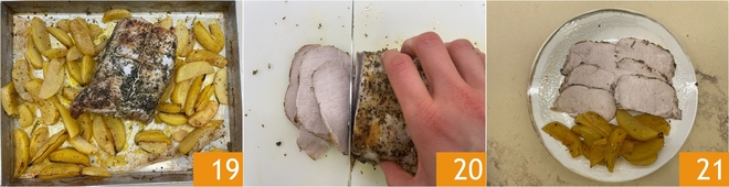 Continue o cozimento por mais 30-40 minutos, sem cobrir a assadeira, até que as batatas estejam douradas e crocantes 19. Uma vez cozido, deixe o porco descansar por 10-15 minutos antes de fatiá-lo 20. Sirva o porco assado com as batatas bem quentes!