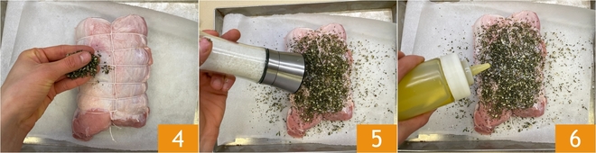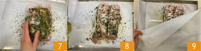 Transfira o assado para uma assadeira com papel manteiga e polvilhe a carne com o picadinho de ervas 4, depois tempere com sal 5, pimenta e azeite 6.