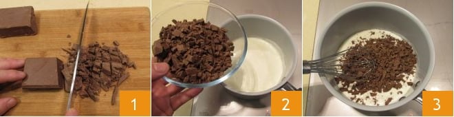 Para fazer os bombons de chocolate e avelã, pique o chocolate gianduia 1, depois aqueça o creme de leite em uma panela e adicione o chocolate picado 2, misture com um batedor 3 até dissolver completamente