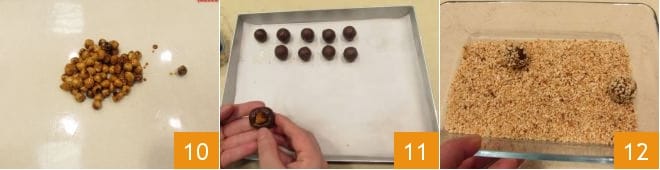 Transfira as avelãs caramelizadas para uma bandeja forrada com papel manteiga ou um tapete de silicone 10, separe as avelãs para evitar que grudem ao esfriar. Monte os bombons: pegue a mistura de gianduia firmada, forme bolas do tamanho de uma noz com a ajuda de uma colher de chá ou um boleador. Crie uma cavidade no centro e insira uma avelã caramelizada 11 e feche ao redor da massa formando uma pequena bola, coloque em uma bandeja forrada com papel manteiga as bolas que você for formando e leve à geladeira para firmar por 5 minutos. Depois, pegue as bolas de gianduia e passe-as na farofa de avelã, de modo que a farofa grude em toda a superfície delas 12.
