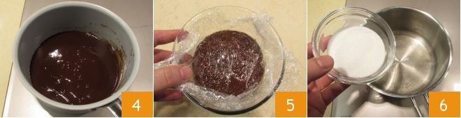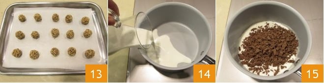 Coloque-as na mesma bandeja coberta com um papel manteiga 13 e mantenha na geladeira. Prepare agora a cobertura: em uma panela, aqueça o creme de leite 14, em seguida, adicione o chocolate gianduia picado 15 e misture com um batedor até que esteja completamente derretido, desta vez você deve obter um molho mais liso. Transfira o molho de cobertura para uma tigelinha.