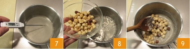 monitore a temperatura da calda com um termômetro culinário 7 e quando atingir 116°C, desligue o fogo e mergulhe as avelãs inteiras 8, mexa até que a mistura fique arenosa 9. Neste ponto, reacenda o fogo sob a panela e derreta o açúcar completamente em fogo baixo, até que tudo adquira uma cor âmbar.