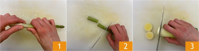 Para preparar o pregado assado, primeiro pré-aqueça o forno a 200°. Limpe os aspargos eliminando a parte branca mais dura 1; se estiverem muito duros, descasque os talos para afiná-los (com os mais novos não é necessário). Corte os talos em pedaços 2 e passe aos alhos-porós: retire a base, desfolhe-os e fatie-os em rodelas com cerca de meio centímetro de espessura 3.
