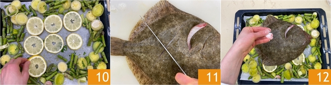 Mova os vegetais para criar um espaço no centro da assadeira, depois coloque aqui as fatias de limão 10; assim o pregado cozinhará mais suavemente, evitando que seque. Faça uma incisão em cruz na pele nas costas do pregado 11, depois posicione-o sobre as fatias de limão 12 e salgue a superfície.