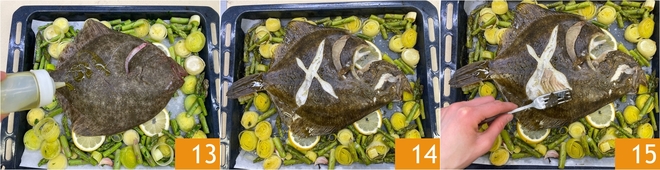 Tempere com um fio de azeite extra virgem 13 e cozinhe por cerca de 25-30 minutos a 200° 14. O pregado estará pronto quando a pele se soltar facilmente ao puxar com um garfo 15.