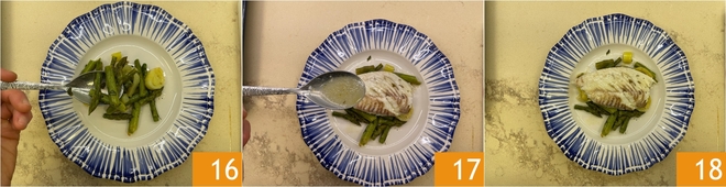 Sirva distribuindo os vegetais na base 16, depois coloque o filé de pregado por cima e tempere com o caldo de cozimento 17. O seu pregado assado está pronto para ser servido 18!