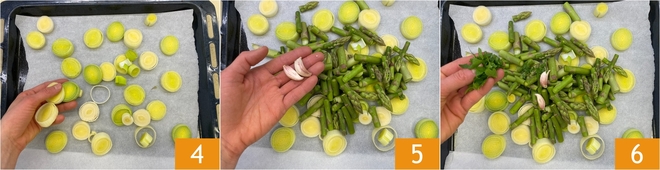 Em uma assadeira forrada com papel manteiga, distribua os alhos-porós 4 e os aspargos, depois tempere com 2 dentes de alho inteiros 5 e a salsinha 6.