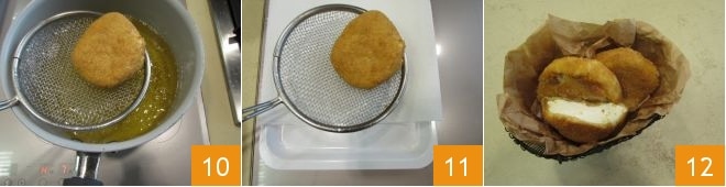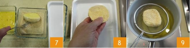Por último, passe na farinha de rosca 7, certificando-se de que esteja bem coberto de todos os lados. Neste ponto, transfira-o para uma bandeja 8 e continue com as outras fatias. Assim que o óleo atingir a temperatura, mergulhe poucos pedaços de cada vez 9, para não abaixar muito a temperatura.