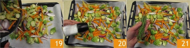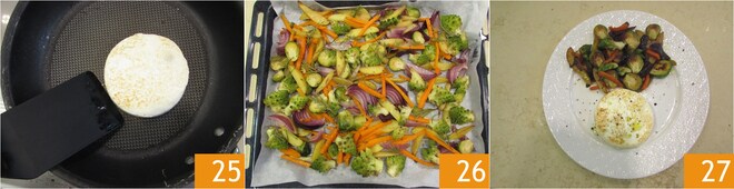 Quando estiver ligeiramente dourado, vire-o 25 e cozinhe por mais 2-3 minutos. Retire agora também os legumes do forno 26. Acompanhe o primosale com os legumes da estação, adicionando uma pitada de pimenta preta e um fio de óleo 27.