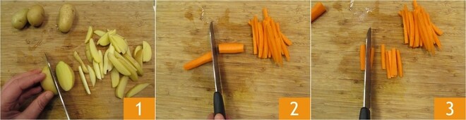 Para preparar o primosale grelhado com legumes, a primeira coisa a fazer é lavar bem todos os legumes. Pegue as batatas e, sem descascá-las, corte-as em gomos 1. Passe para as cenouras: descasque e corte-as ao meio 1. Em seguida, corte em fatias e finalmente em palitos 3.