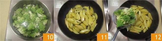 Escalde por 3-4 minutos 10. Enquanto isso, verifique também as batatas para não queimá-las 11. Usando uma escumadeira, retire a couve-romanesca e transfira para as batatas 12.