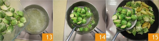 Na mesma água de cozimento, adicione a couve-de-bruxelas 13, cozinhe por 2-3 minutos e, como antes, escorra com a escumadeira 14. Transfira para a panela com as batatas 15.