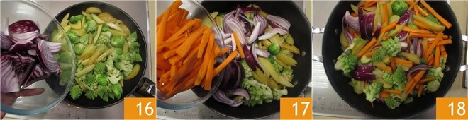 Adicione também as cebolas 16, as cenouras 17 e salteie tudo 18.