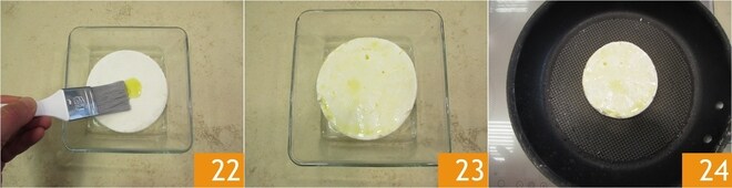 Quando faltarem poucos minutos, comece a preparar o primosale. Coloque uma frigideira no fogo e deixe aquecer. Unte com um pincel o primosale 22, dos dois lados 23. Coloque o queijo na frigideira quente e cozinhe por 2-3 minutos em fogo médio 24.