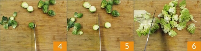 Agora cuide da couve-de-bruxelas, elimine as folhas externas e a parte inferior 4, corte-as ao meio 5 e reserve. Pegue a couve-romanesca e separe os floretes 6, se forem muito grandes, corte-os ao meio 6.