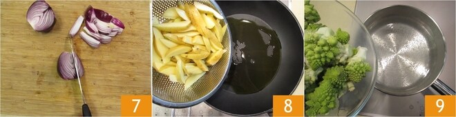 Agora corte também as cebolas em gomos 7. Coloque no fogo uma panela cheia de água que será usada para ferver os legumes. Quando estiver quente, despeje em outra frigideira uma boa quantidade de óleo e acrescente as batatas 8. Salteie por cerca de 5 minutos. Enquanto isso, mergulhe a couve-romanesca na água que já terá atingido a fervura.