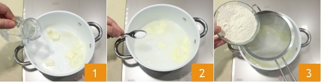 Para preparar os profiteroles salgados, comece pela Massa choux (bignè): em uma panela, coloque a água e a manteiga 1 para derreter em fogo alto, mexendo com uma colher de pau; você também pode adicionar uma pitada de sal 2. Quando estiver derretido e a água ferver, adicione a farinha (você pode peneirá-la com uma peneira) 3 e reduza o fogo.