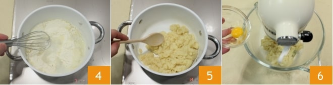 Misture rapidamente com um batedor para evitar a formação de grumos 4 e cozinhe por mais 2-3 minutos, sempre em fogo baixo. Quando a mistura começar a se solidificar mais, passe a misturar com a colher de pau até que se solte das paredes e crie uma película branca no fundo 5. Neste ponto, retire a massa do fogo, coloque-a na tigela de uma batedeira e encaixe o batedor em forma de folha. Adicione um ovo de cada vez 6, esperando que o primeiro seja incorporado antes de adicionar o próximo.
