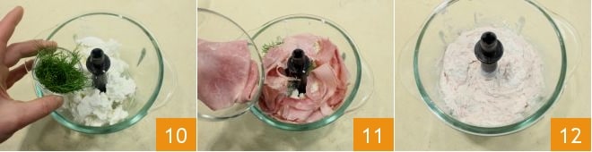 Enquanto os profiteroles assam, dedique-se ao creme de presunto (você pode fazer 3 cremes diferentes à base de ricota: com presunto, com salmão e aromatizado com uma mistura de ervas aromáticas). Em um processador, coloque a ricota, o endro 10 e as fatias de presunto cozido 11. Bata tudo até obter um creme homogêneo 12.