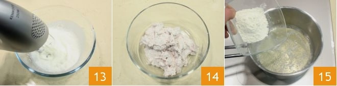 À parte, bata o creme de leite com a batedeira elétrica 13 e incorpore-o delicadamente ao creme de presunto, misturando com uma espátula delicadamente de baixo para cima para não desmontar. Deixe o creme obtido de lado 14: cubra-o com filme plástico e guarde na geladeira. Dedique-se ao creme de gruyère que servirá para cobrir os profiteroles: em uma panela, coloque a manteiga e deixe derreter em fogo baixo; depois, adicione a farinha peneirada aos poucos 15,
