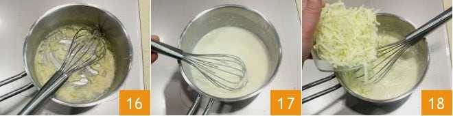 misture com o batedor e crie o roux em fogo baixo 16. Em seguida, adicione o leite e misture tudo continuamente 17; ajuste o sal e, quando o creme estiver denso, adicione o gruyère ralado 18.