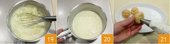 Deixe o queijo derreter, sempre misturando com o batedor 19 e desligue o fogo 20. Agora, pegue as bombinhas completamente frias e faça um pequeno furo na parte plana das bombinhas, para recheá-las com os cremes usando os sacos de confeitar 21; se você fez os três cremes diferentes, pode rechear 10 com o recheio de presunto, 10 com o de salmão e 10 com o de ervas.