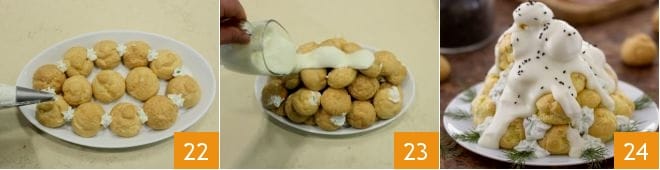 Disponha as bombinhas em formato de pirâmide, começando pela base ampla, decorando os espaços entre uma e outra com pitadas de creme com o saco de confeitar com bico em forma de estrela 22 e com o creme de gruyère 23 até formar uma pirâmide. Decore ainda mais com sementes de papoula, se preferir, e sirva seus profiteroles salgados com creme de gruyère 24!