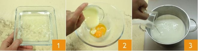 Preparação Para realizar o pudim de chocolate, coloque em uma tigela com água fria a gelatina em folhas por pelo menos 10 minutos 1. Enquanto isso, em uma tigela bata as gemas com o leite condensado 2, aqueça o leite em uma panela em fogo baixo 3