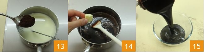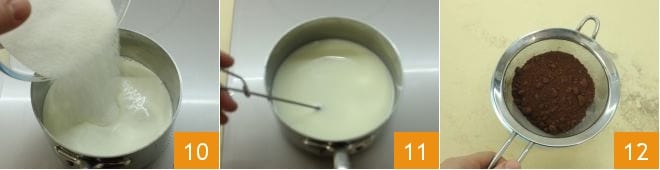 e adicione também o açúcar 10, aqueça a mistura e misture para dissolver o açúcar 11. À parte, peneire o cacau amargo 12