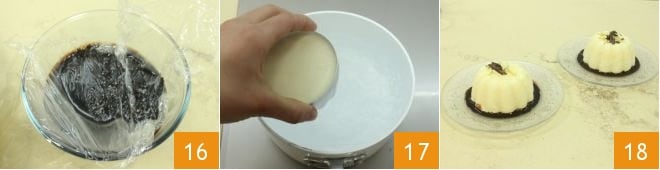 Em seguida, deixe esfriar com um filme plástico em contato para evitar a formação de uma película na superfície 16. Quando o pudim estiver bem firme, você pode desenformá-lo; para facilitar essa operação, mergulhe o molde por alguns instantes em uma panela com água quente 17 e depois vire-o no prato de servir, sobre o qual você terá despejado uma camada de molho de chocolate, e depois decore o pudim com algumas raspas de chocolate amargo 18.