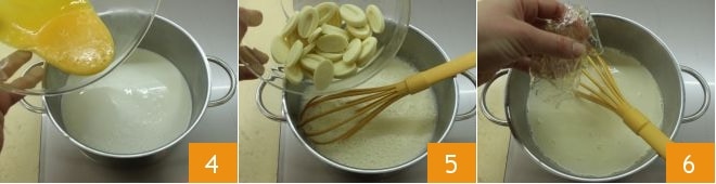 depois despeje a mistura de ovos mexidos 4 e incorpore o chocolate branco 5. Por último, adicione a gelatina em folhas escorridas e bem espremidas 6 e misture até a completa dissolução.