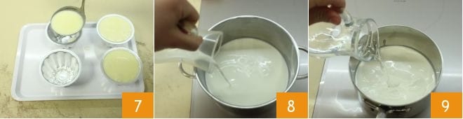 Transfira a mistura para 4 moldes com capacidade de 250 ml, despejando-a com uma concha 7 e deixe os pudins endurecerem na geladeira por pelo menos 4 horas. Enquanto isso, prepare o molho de chocolate amargo: em uma panela, despeje o creme de leite 8, a água 9,