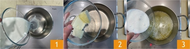 Para preparar o pudim de chocolate e noz-moscada com coulis de maçã, comece aquecendo o leite em uma panela 1. Enquanto isso, em uma panela maior, adicione a manteiga 2 e deixe derreter em fogo baixo. Adicione então o açúcar assim que estiver completamente derretido 3.