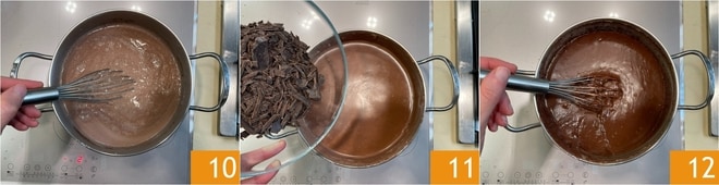 Assim que obter uma mistura homogênea, aumente o fogo e deixe cozinhar por 5 minutos 10. Adicione o chocolate 11 e cozinhe até que esteja completamente derretido 12.