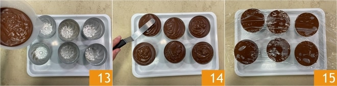 Despeje a mistura em 6 forminhas de pudim (diâmetro 8 cm e altura 5 cm). Nivele a superfície 14, cubra com filme plástico 15 e deixe esfriar primeiro em temperatura ambiente e depois na geladeira por pelo menos 2-3 horas.