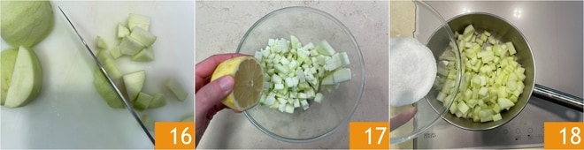 Enquanto isso, prepare o coulis de maçã: descasque-as e corte em pedaços de 1 cm 16. Transfira para uma tigela e tempere com o suco de um limão 17. Em seguida, despeje em uma panela com o açúcar e deixe cozinhar em fogo médio até que comecem a caramelizar.