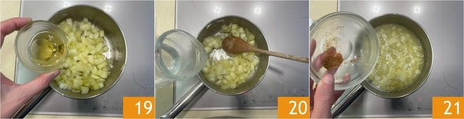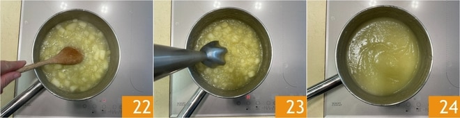Cozinhe por mais alguns minutos até que a água evapore 22; as maçãs devem ficar macias, depois bata a mistura com um mixer de imersão até obter um creme liso 24.