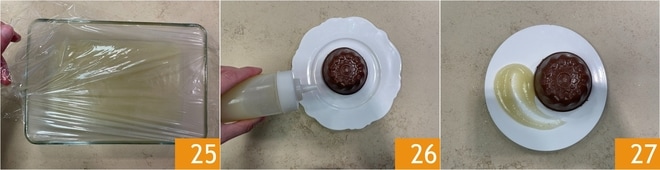 Transfira para um recipiente, cubra com filme plástico e deixe esfriar 25. No momento de servir o pudim, desenforme-o em um pratinho e sirva com o coulis de maçã ao lado 26. Por conveniência, usamos uma garrafinha. O pudim de chocolate e noz-moscada com coulis de maçã está pronto 27.