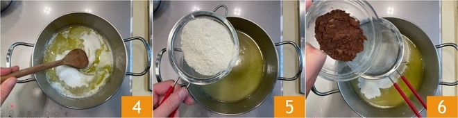 Misture bem 4 e acrescente a farinha peneirada 5 e o cacau, também peneirado 6.