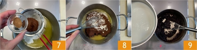 Adicione também a noz-moscada 7 e misture bem com um batedor de claras 8 para evitar a formação de grumos. Agora adicione o leite quente aos poucos 9.