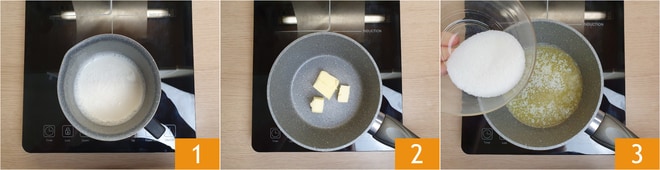 Para preparar o pudim de chocolate, aqueça o leite em uma panela 1 e leve-o quase à fervura, em fogo moderado. Em outra panela, derreta a manteiga 2 e adicione o açúcar 3.