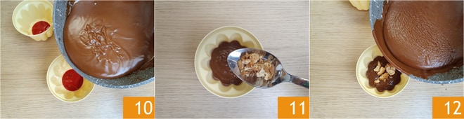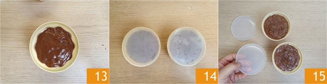 Deixe esfriar em temperatura ambiente 13, cubra com as tampas das formas 14, depois coloque no refrigerador por pelo menos 3 horas. Após o tempo, retire as tampas 15.