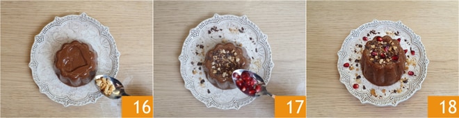 Desenforme o pudim de chocolate em um prato pequeno e sirva, decorando a superfície com amaretti esmigalhados, lascas de chocolate e sementes de romã 17, para um toque de cor 18.