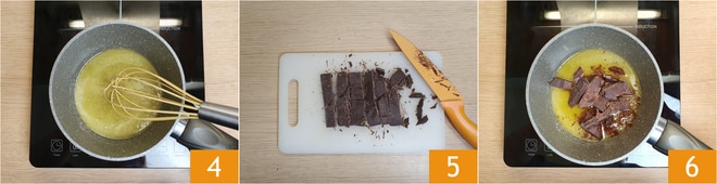Mexa com um batedor para misturar 4. Pique o chocolate com uma faca, de forma bastante grosseira 5, e adicione-o à panela com a manteiga 6. Deixe derreter em fogo moderado, mexendo com um batedor manual.