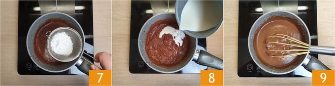 Quando a mistura estiver completamente fluida, adicione o amido de milho peneirado 7 e incorpore com o batedor. Desta forma, não se formarão grumos. Como último passo, adicione também o leite quente aos poucos 8, mexendo com o batedor 9. Cozinhe o pudim por alguns minutos, até começar a engrossar. Retire do fogo assim que começar a se compactar: ao esfriar, ele se tornará completamente firme.