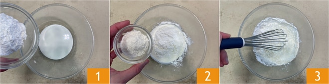 Para preparar o pudim de gianduia com molho de laranja, coloque em uma tigela o creme de leite, o amido de milho 1 e a farinha 2, misture com o batedor 3.